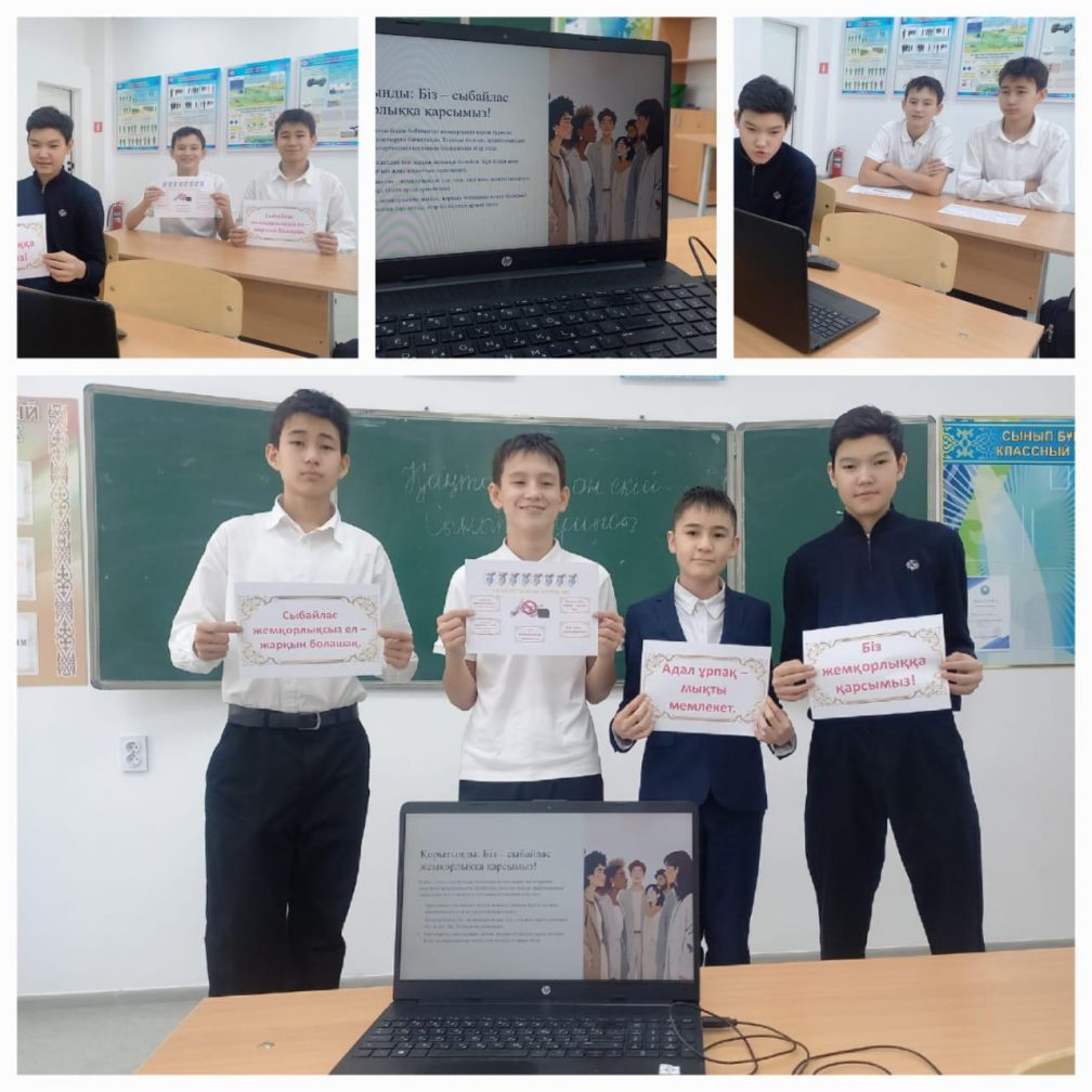 Сабақтың мақсаты – оқушыларға сыбайлас жемқорлықтың мәні мен қоғамға зиянын түсіндіру, адалдық пен әділдік құндылықтарын қалыптастыру. Іс-шара барысында бейнематериал көрсетіліп, сұрақ-жауап пен пікір алмасу ұйымдастырылды. Оқушылар өз ойларын еркін білдіріп, сыбайлас жемқорлыққа қарсы көзқарастарын дәлелдеді.